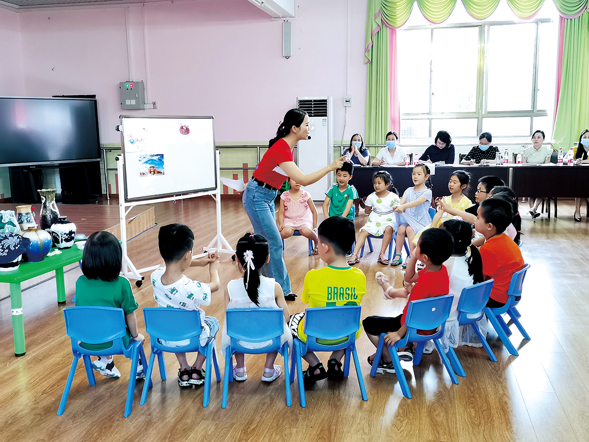 玉屏幼儿园的语言公开课《趣说荣昌陶》和艺术公开课《快乐织布娃》,将荣昌“非遗”文化与孩童教育相结合,利用“荣昌四宝”构建园本课程,让前来参观的老师印象深刻。