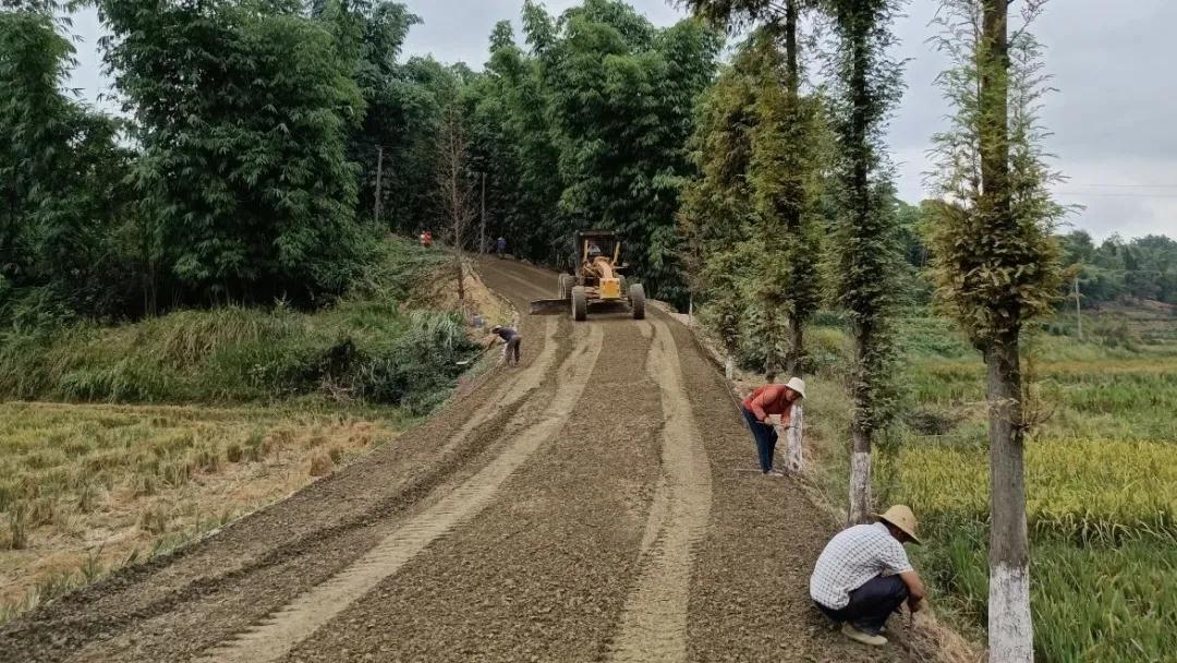 近日,记者在双河街道金佛社区和排山坳社区的千土公路“四好农村路”建设现场看到,伴随着机器的轰鸣,工人师傅们正加紧对该路段的水稳层进行施工。