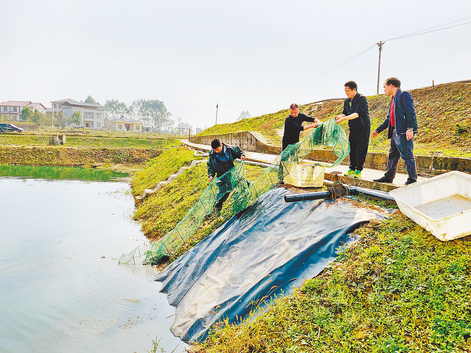 荣昌区河中村五组的澳洲龙虾养殖基地,负责人张青龙(右二)正在收获龙虾。