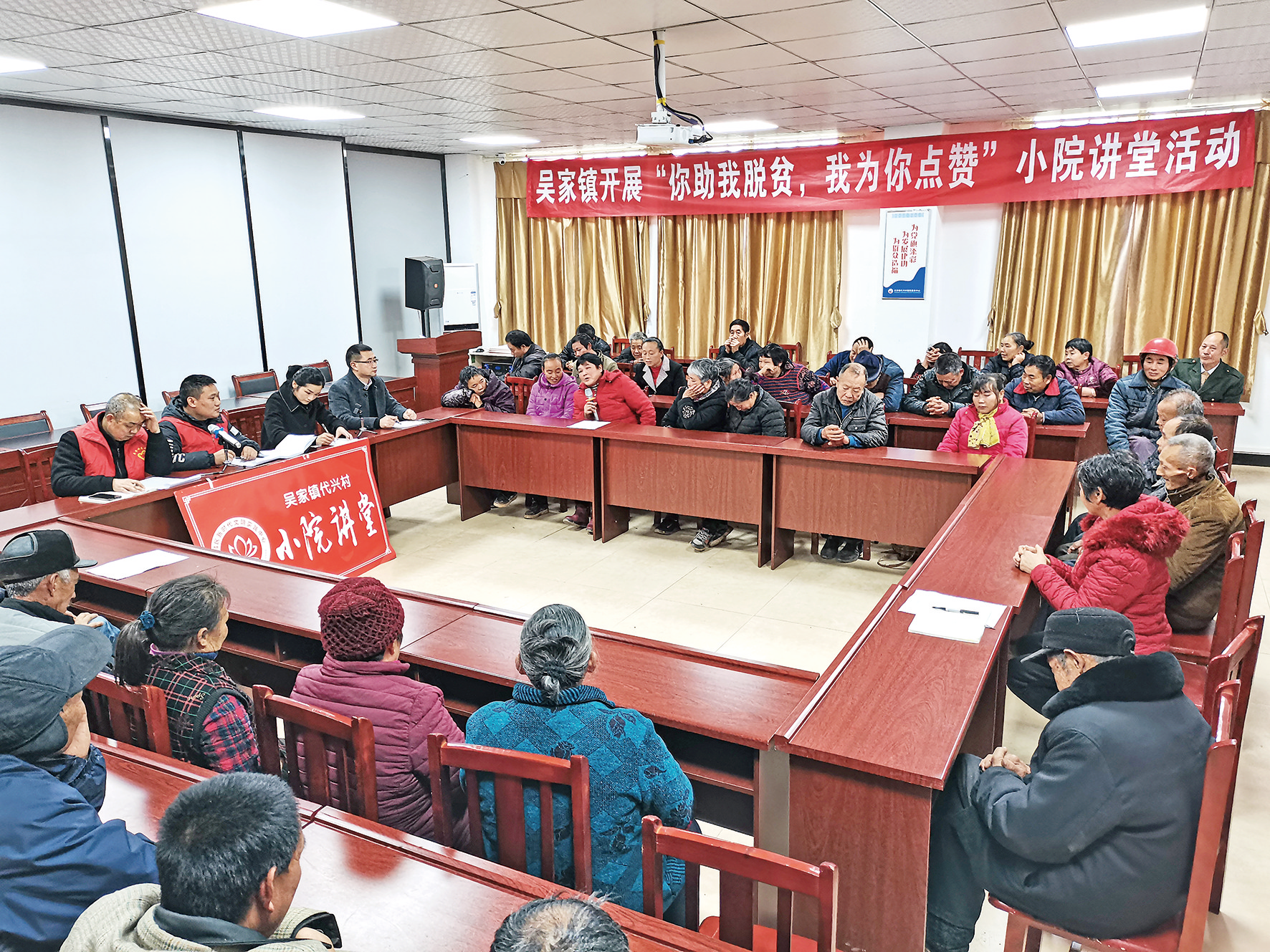 近日,在吴家镇代兴村,窗外阴雨连绵,村办公室里却是一片热闹,正在开展小院讲堂“你助我脱贫,我为你点赞”活动,50余名脱贫户讲述自己的脱贫故事,写感恩语,为如今的幸福生活点赞。