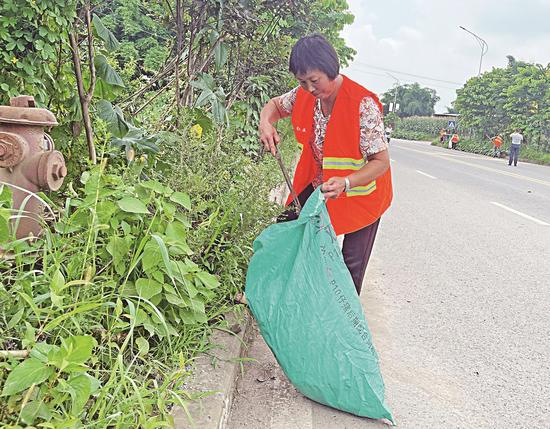 7月24日,在该镇瑶山社区大荣路加油站路段,保洁员和志愿者正有序对公路沿线农用废弃薄膜、乱丢的烟头和小吃包装袋等垃圾进行集中清理。