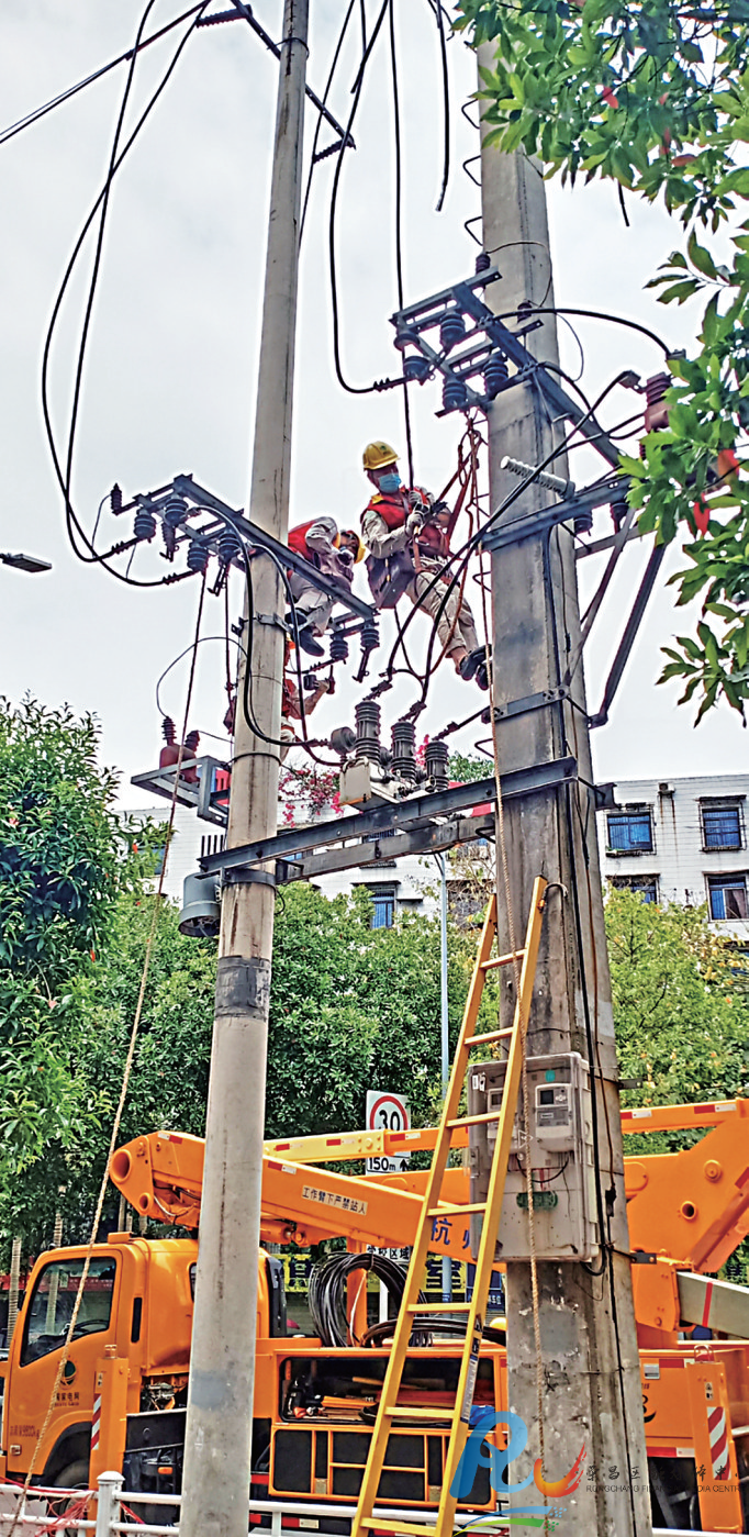 检查、安装、测试……近日,在桂花园小学的荣东线#10号杆抢修现场,几名电力抢修人员正进行高空作业。
